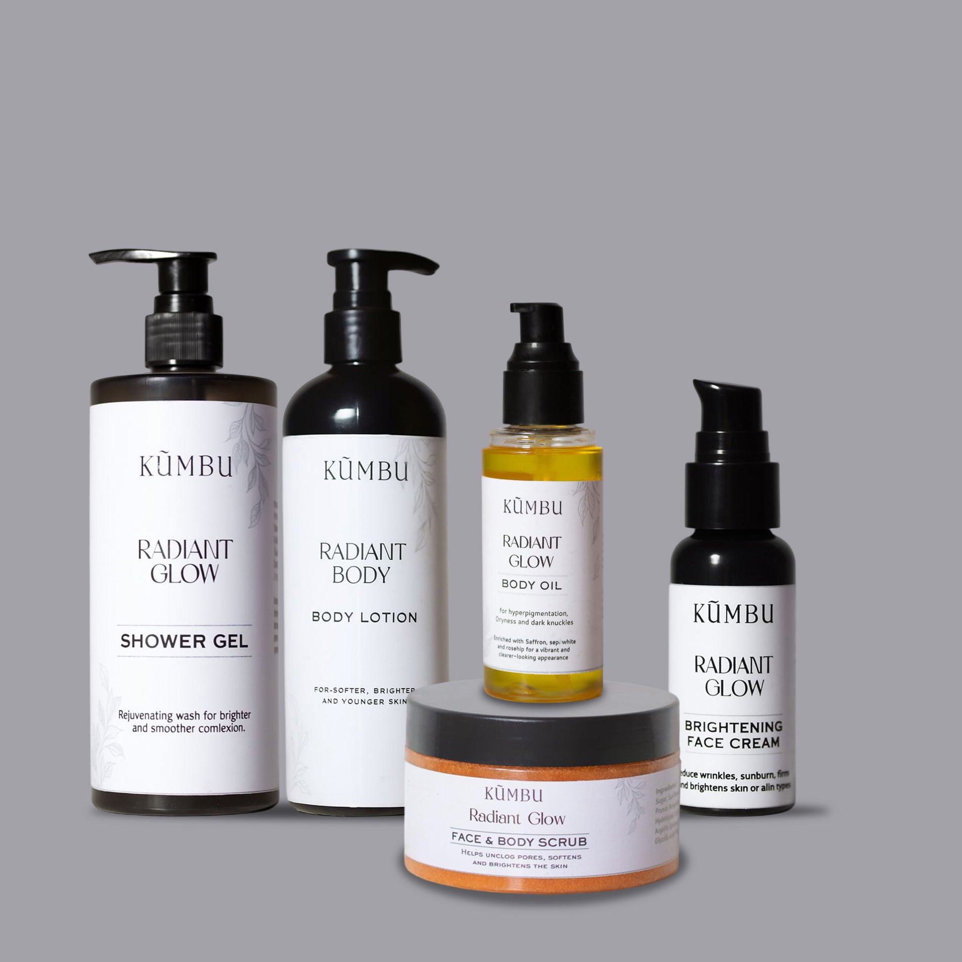 What's included: 16oz Brightening Shower Gel + 10oz Brightening Body Lotion + 8oz Brightening Body Scrub + 4 oz Lightening Body Oil + 2oz Brightening Face Cream.